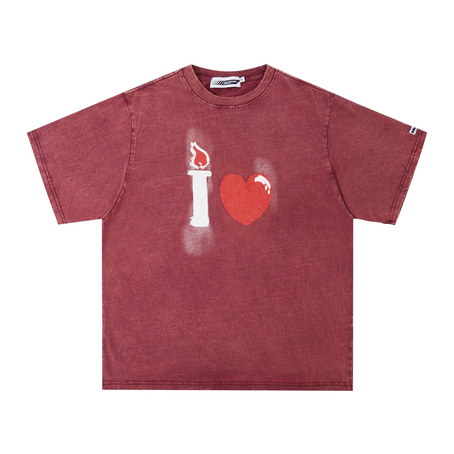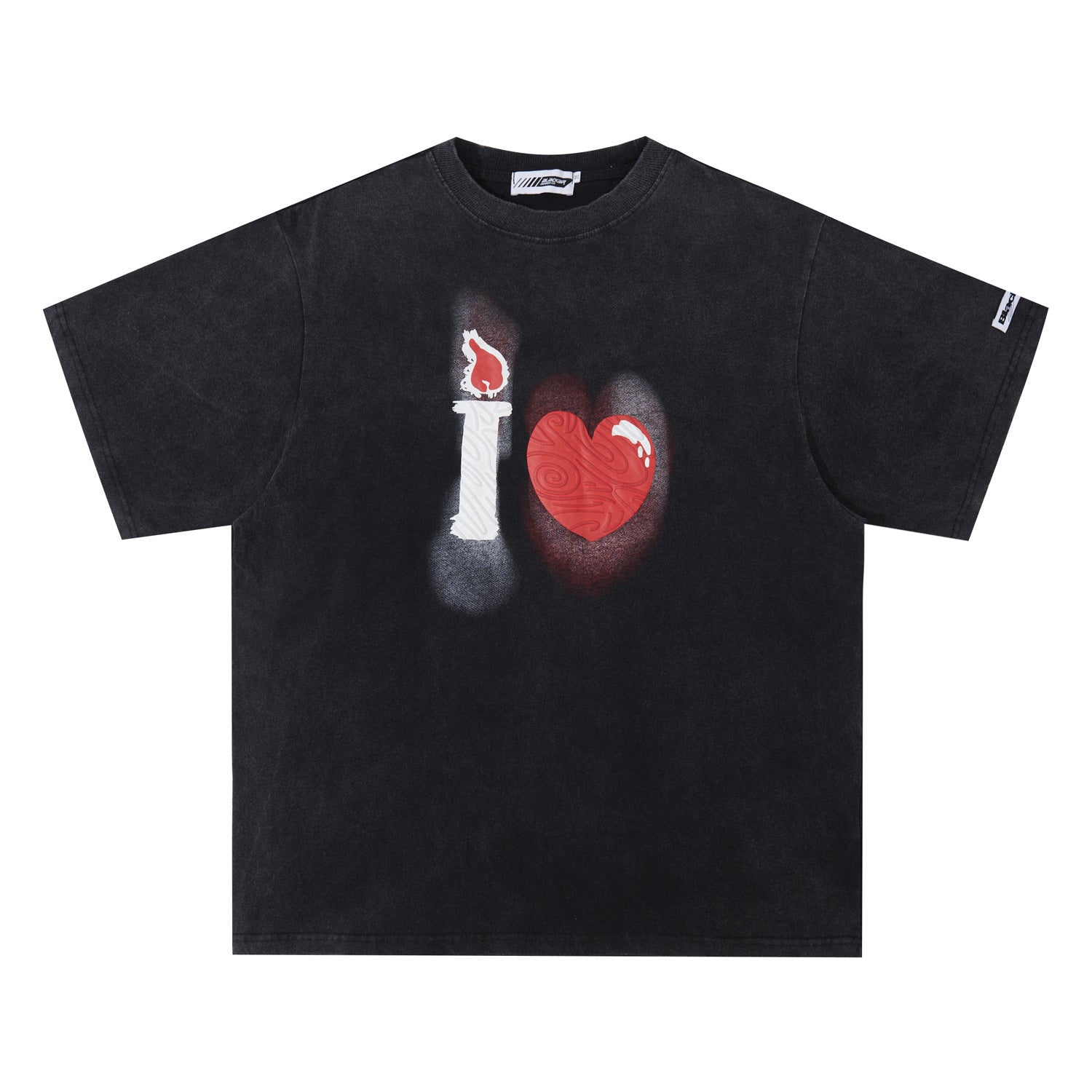 American Retro Washed And Worn Street Tide Brand Men's Clothing Heart Printing Loose Casual Short-sleeved T-shirt
